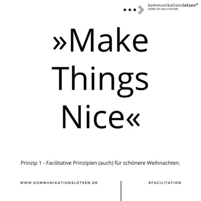 „Make Things Nice“. Es schenkt uns für unsere facilita tive Haltung – nicht nur zu Weihnachten – Orientierung. In der Sprache und Denkweise erdgebundener Kulturen bedeutet dieser Satz weit mehr als nur das oberflächliche „Dinge schön machen“. Die Grundidee ist, dass man in allem, was man tut, Sorgfalt und Respekt walten lassen sollte, um Schönheit und Harmonie in die Welt zu bringen.